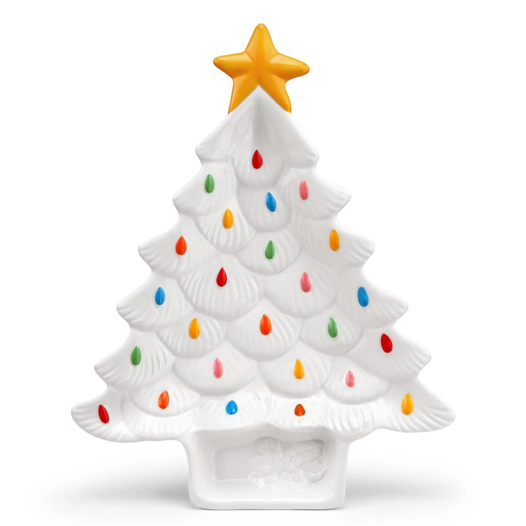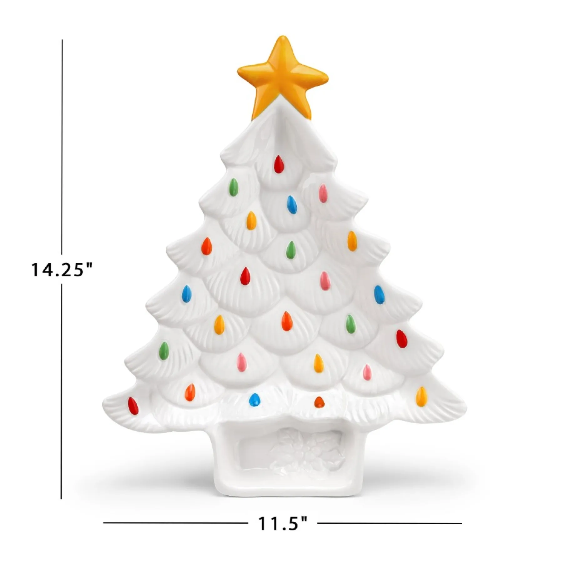 Serving Memories Of Christmases Past Along With Your Sweet Holiday Treats Is The Nostalgic Tree Plate By Mr. Christmas. A Beautiful Two-Tone White Tree Features Hand-Painted Details Along The Length Of The 14.25″ Long Plate. This Platter Is Decorated With Multi-Colored Lights And A Yellow Star Topper To Complete The Stunning Presentation. Display Your Favorite Christmas Cookies For Santa In Style On This Ceramic Plate, Or Give It To Any Baker On Your Christmas List.